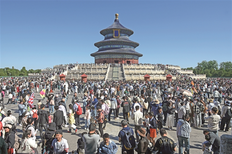经文化和旅游部数据中心测算, “五一”假期期间,全国国内出游3.14亿人次,同比增长6.4%;国内游客出游总花费1802.69亿元,同比增长8.0%。图为“五一”假期,北京天坛公园祈年殿前游人如织。新华社发(王跃武 摄)